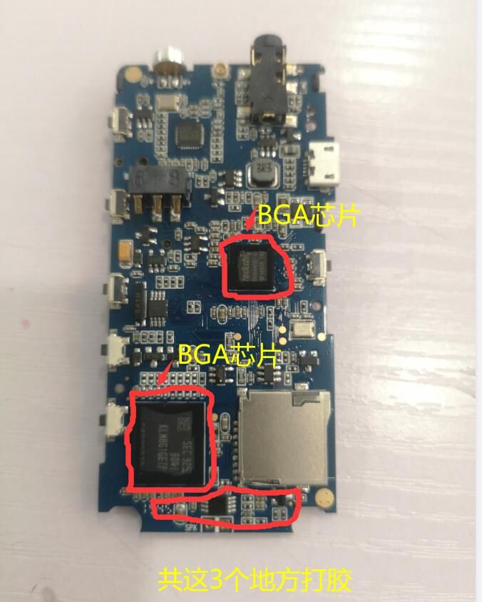 用膠部位:mp3復讀機主板有兩個BGA芯片和一些阻容元件需要點膠